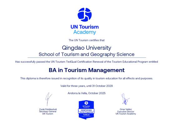 联合国旅游组织旅游教育质量认证体系(UN Tourism TedQual Certification)于1998年创设,旨在提高全球旅游教育、旅游培训及旅游研究项目的质量,推广全球旅游伦理道德规范,对评价和提高旅游院校的教学及综合管理水平具有重要意义,在旅游教育的质量监控、程序标准化、内容品质化和视野国际化方面均具有极高的显示度。获得联合国旅游组织旅游教育质量认证是成为全球一流旅游院校的重要评价标准。